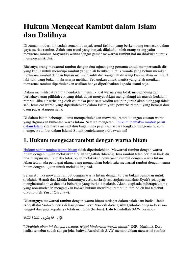 Hukum Mewarnai Rambut By Djayanti Pdf. Namun ada dalil lain yang menunjukkan kemakruhannya Anas bin Malik radhiyallahu anhu mengatakan. Anggota Fatwa Dar al-Ifta Mesir Syekh Ahmad Wissam menjelaskan diperbolehkan bagi pria untuk mewarnai rambut selama warnanya tidak meresahkan masyarakat.